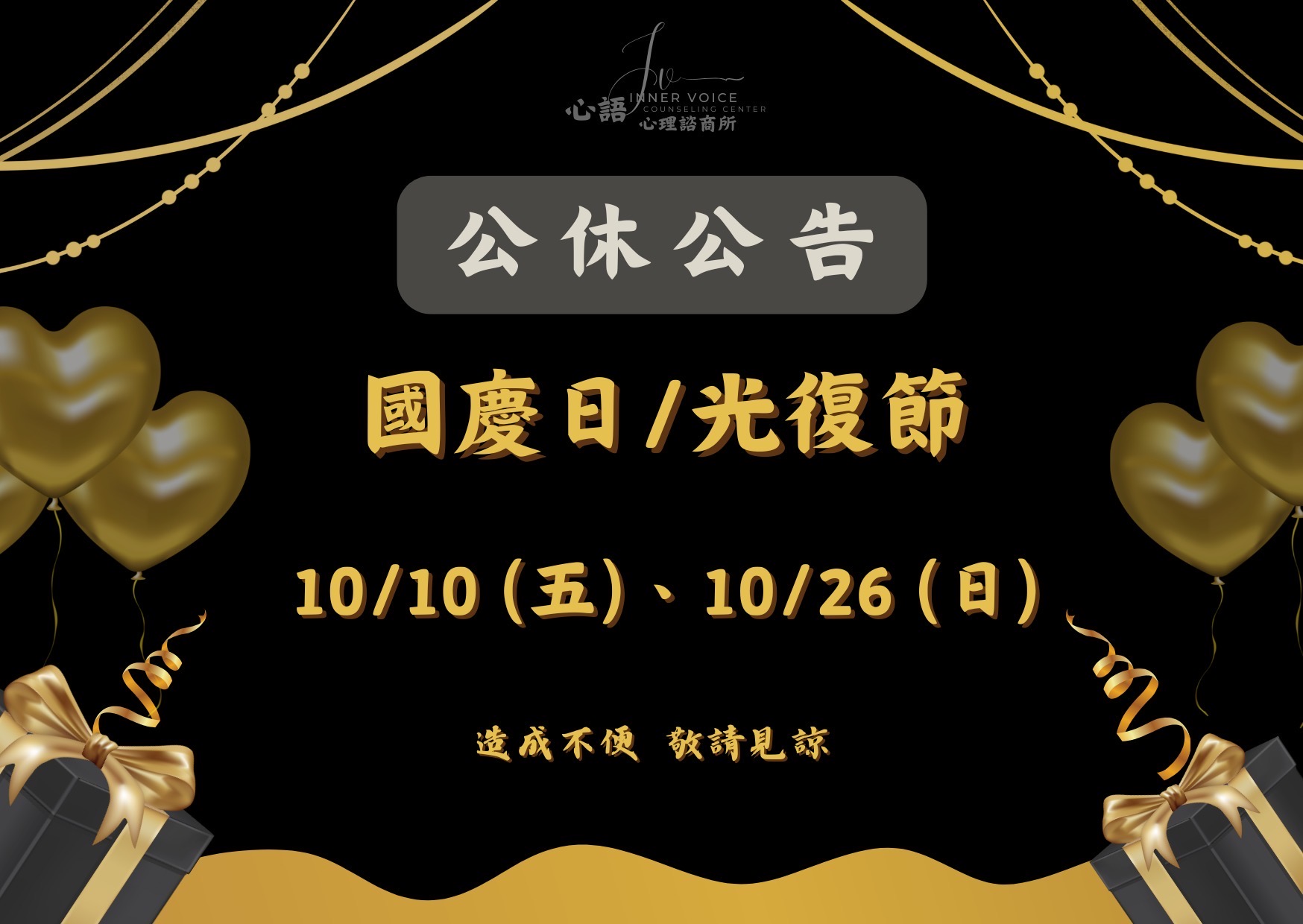 歡慶國慶日與光復節 心語心理諮商所 公休二日